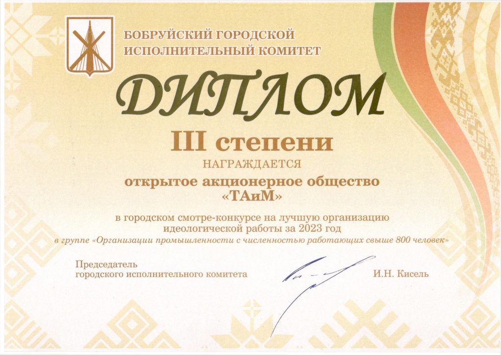 Диплом в группе "Организации промышленности с численностью работающих свыше 800 человек" в городском смотре-конкурсе на лучшую организацию идеологической работы за 2023 год