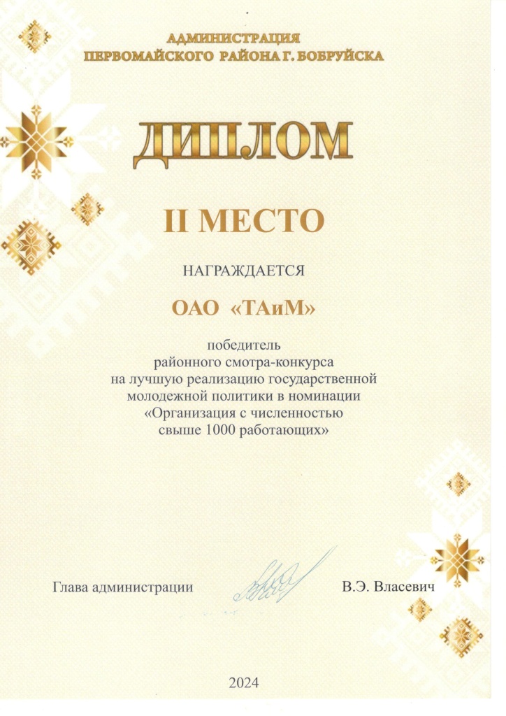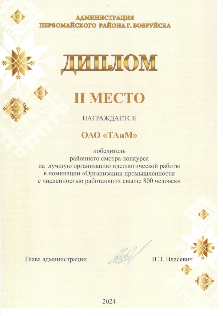 Диплом II место в районном смотре-конкурсе на лучшую организацию идеологической работы в номинации "Организации промышленности с численностью работающих свыше 800 человек", 2024 год