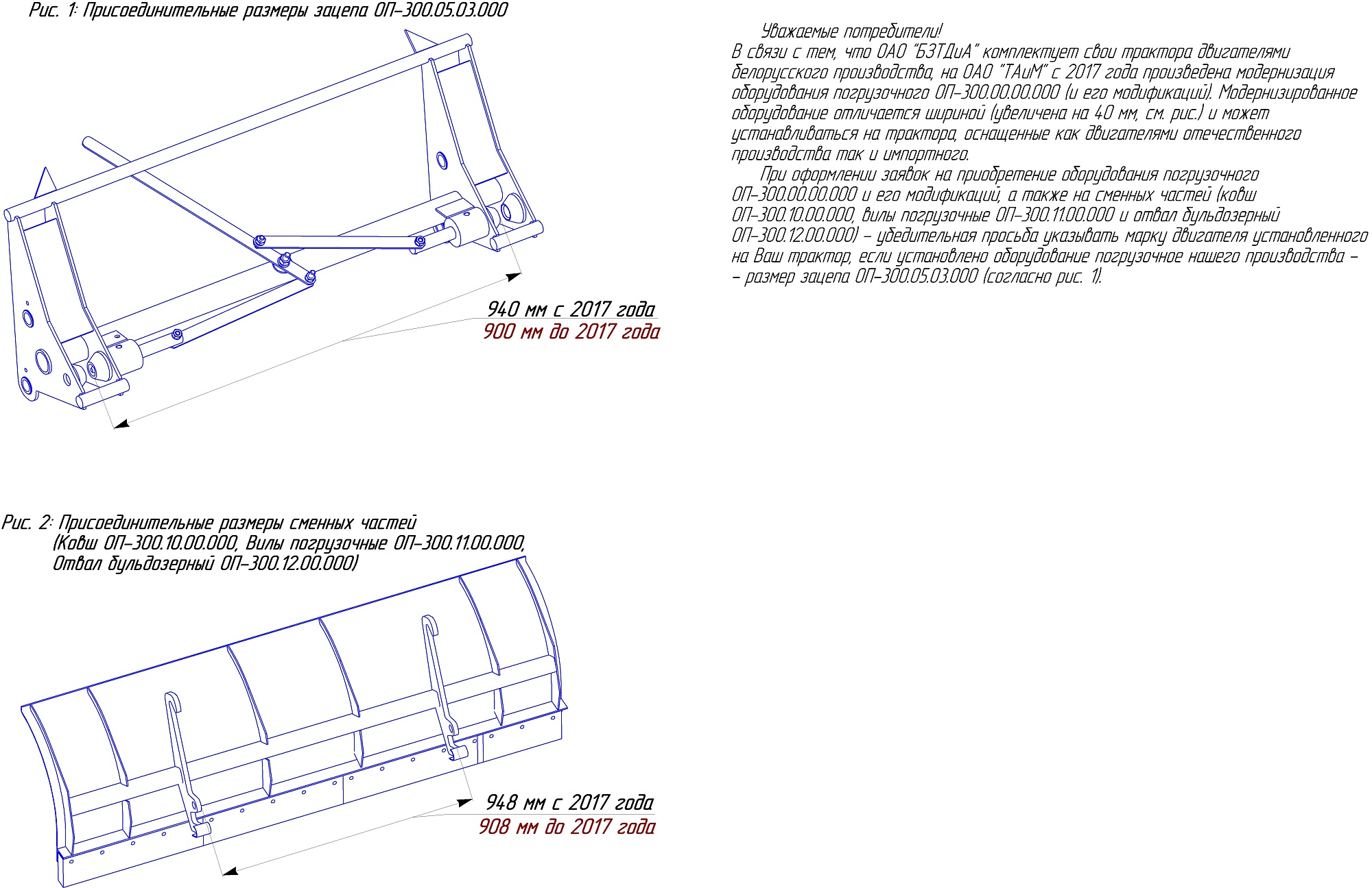 Быстросъемный ковш ОП-300.10.00.000-01 Погрузочные вилы ОП-300.11.00.000 Бульдозерный отвал ОП-300.12.00.000 |