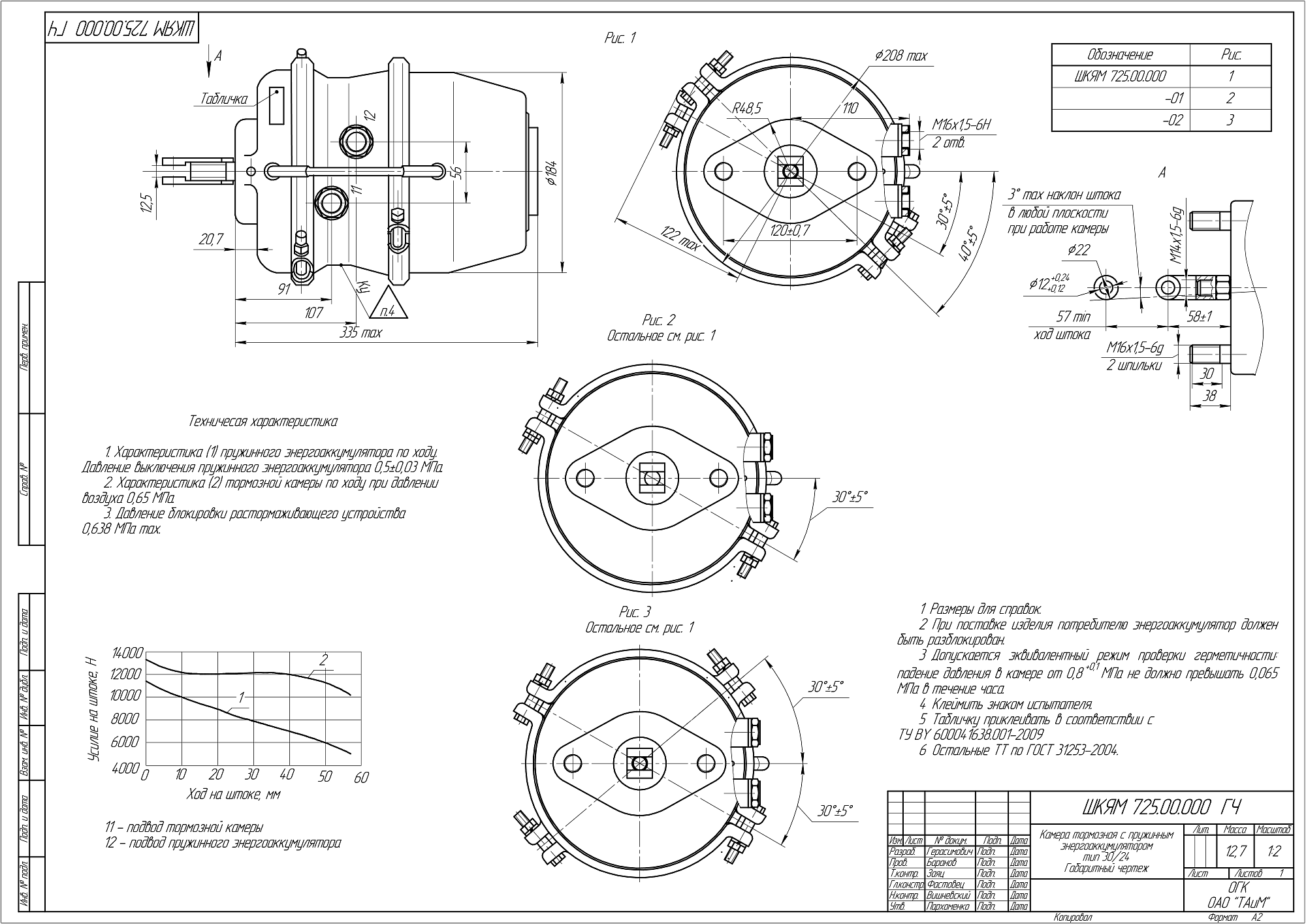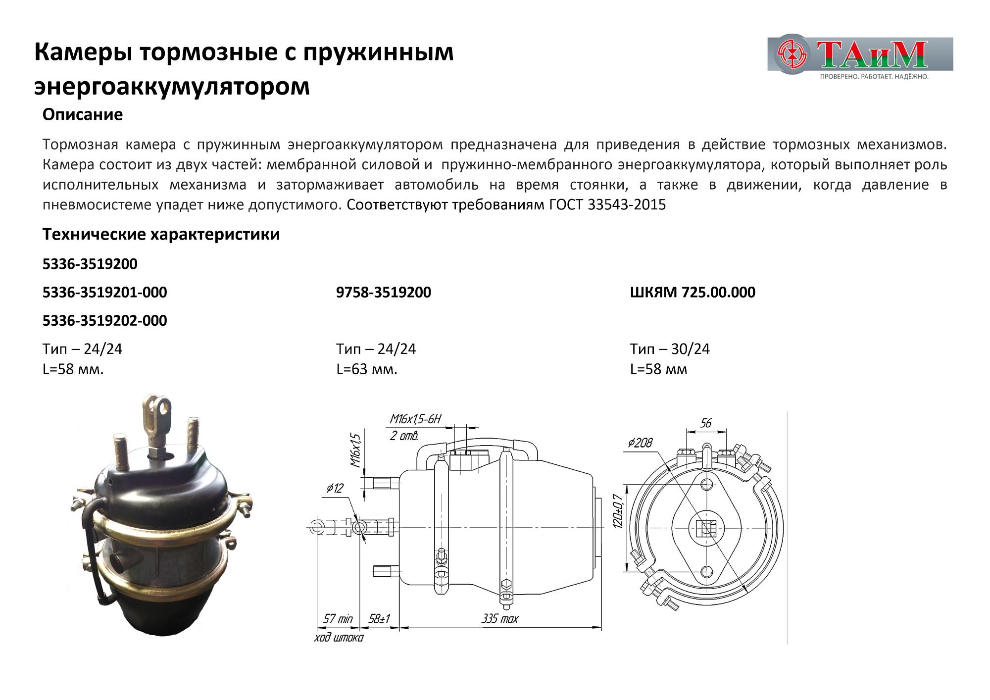Тормозная камера с пружинным энергоаккумулятором предназначена для приведения в действие тормозных механизмов. Камера состоит из двух частей: мембранной силовой и пружинно-мембранного энергоаккумулятора, который выполняет роль исполнительного механизма и затормаживает автомобиль на время стоянки, а также в движении, когда давление в пневмосистеме упадет ниже допустимого. Соответствуют требованиям ГОСТ 33543-2015