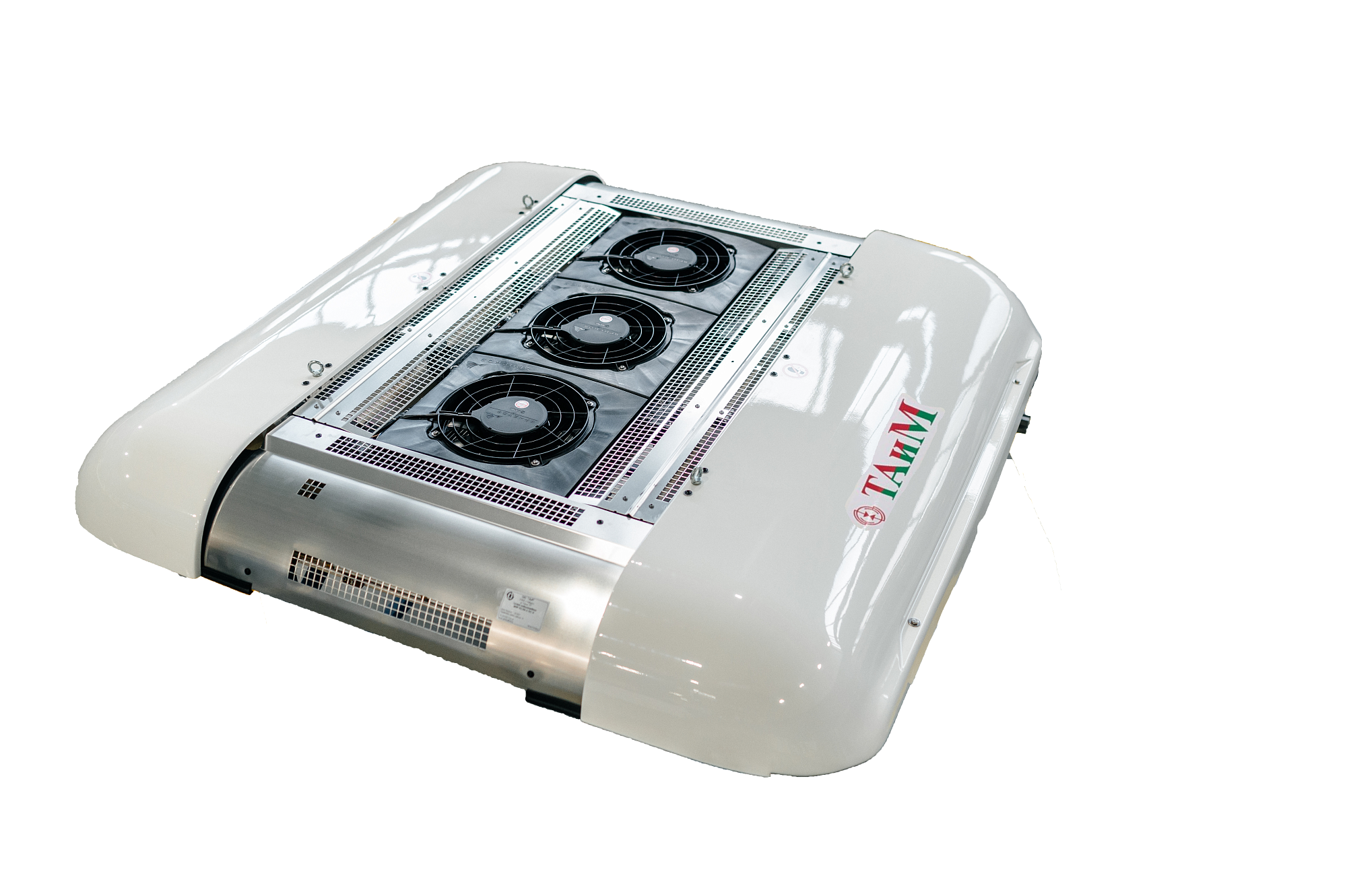 Накрышный блок состоит из правого и левого испарителя, конденсатора, которые соединены между собой трубками хладагента. Сверху расположены электрические аксиальные вентиляторы для охлаждения конденсатора, снизу радиальные электрические для рассеивания охлажденного воздуха по салону. С выведенными необходимыми электрическими коммуникациями для соединения их с системой автобуса